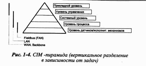 Объединение систем компьютеров в сеть приобретает настолько сложный характер, что плоская архитектура сети теряет всякий смысл. Во всех областях автоматизации предпочтение отдается сетям с вертикальной иерархией систем, в которых на каждом уровне можно реализовать логически обособленный набор функций. Рассмотрим пятиуровневую модель некоего автоматизированного производства [рис.1-4]. Слева от нее находится сеть, с помощью которой можно упорядочить уровни. Понятно, что количество уровней и их вид зависят от набора параметров, определяющих конкретную систему. При автоматизации систем зданий эта схема выглядит совсем не так, как в случае системы управления технологическими процессами. Разумеется, от начальных условий (набора функций для конкретного уровня) зависит, какая сеть и на каком уровне будет использована, - практика заставляет думать более гибко.