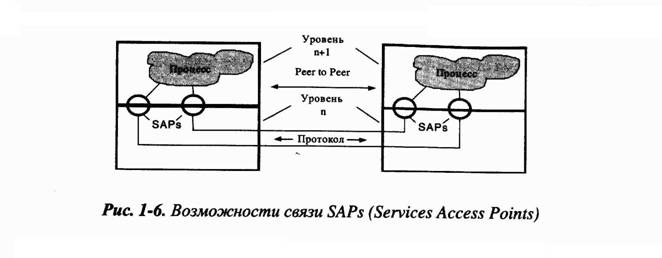 Еще несколько замечаний относительно модели ISO/OSI. Различают два направления коммуникации [рис.1-6]. Коммуникация между некоторым уровнем п и уровнем выше (n +1) осуществляется посредством интерфейса, построенного на основе спецификаций служб. Верхний уровень является «пользователем служб» (SU, Service User), а нижний - их «поставщиком» (SP, Service Provider). Обмен информацией между уровнями осуществляется в точках доступа к службе (Service Access Points, SAP), причем элемент более высокого уровня может обращаться к элементу более низкого уровня. Это важно, если, например, нужно соединить уровни с помощью другого пути, что достигается выбором специальных SAP.