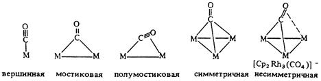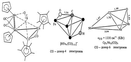 Как уже отмечалось выше, координация СО по обоим атомам возможна, хотя и встречается относительно редко. При такой координации происходит значительное удлинение связи С-О (от 1.13 до 1.30 А). Примеры такой координации приведены ниже.