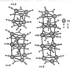 Pd4(CO)4(OAc)4 имеются только µ-СО-группы. В кластере [Pt3(CO)6]2-n наблюдаются два типа координации СО – и концевые, и мостиковые лиганды СО, причем в каждом металлотреугольнике Pt3 представлены по три лиганда обоих типов координации.