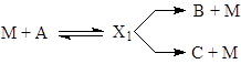 7) Примените условие стационарности стадий для вывода кинетического уравнения двухмаршрутной реакции с тремя стадиями