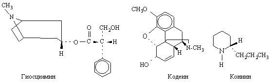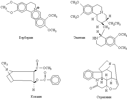 Начало химии алкалоидов обычно относят к 1803, когда Л.-Ш.Деронь выделил из опиума – высохшего на воздухе млечного сока снотворного (опийного) мака Papaver somniferum – смесь алкалоидов, которую он назвал наркотином. Затем в 1805 Ф.Сертюрнер сообщил о выделении морфина из опиума. Он приготовил несколько солей морфина и показал, что именно морфином обусловливается физиологическое действие опиума. Позднее (1810) Б.Гомес обработал спиртовый экстракт коры хинного дерева щелочью и получил кристаллический продукт, который назвал «цинхонино,». П.Пельтье и Ж.Кавенту на фармацевтическом факультете Сорбонны (1820) выделили из «цинхонино» два алкалоида, названные хинином и цинхонином. Позднее исследователи получили более двух десятков оснований из экстрактов коры хинного дерева и растений рода ремиджия (Remijia) сем. мареновых. Между 1820 и 1850 было выделено и описано большое число алкалоидов новых разнообразных типов. Среди них аконитин из растений рода аконит (Aconitum, борец) – одно из наиболее токсичных веществ растительного происхождения; атропин – оптически неактивная форма гиосциамина и мощное мидриатическое средство (даже 4*10–6 г вызывают расширение зрачка); колхицин – алкалоид безвременника осеннего, применяемый при лечении подагры; кониин представляет особый исторический интерес, поскольку именно он стал орудием казни Сократа в 399 до н.э., когда великий философ был вынужден выпить чашу с настоем болиголова (Conium maculatum); кодеин – близкий к морфину алкалоид, являющийся ценным обезболивающим и противокашлевым средством; пиперин – алкалоид черного перца (Piper nigrum); берберин – алкалоид из корней барбариса обыкновенного (Berberis vulgaris); стрихнин – очень ядовитый алкалоид, содержащийся в семенах чилибухи (Strychnos nux-vomica) и используемый при некоторых сердечных болезнях и для истребления грызунов; эметин содержится в корне ипекакуаны (Cephaelis ipecacuanha, рвотный корень) – рвотное и противопротозойное средство, применяется для лечения амебной дизентерии; кокаин содержится в листьях тропических растений рода Erythroxylum, главным образом в коке (E. coca), используется в медицине как местноанестезирующее средство:
