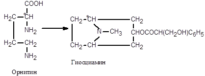 В основе биосинтеза алкалоидов лежит образование соответствующих гетероциклов. Исходными веществами для образования гетероциклов, содержащих азот, являются аминокислоты или продукты их декарбоксилирования - амины. Приведем конкретные схемы образования ряда гетероциклов на основании опытов по кормлению растений мечеными аминокислотами. Меченые атомы углерода обозначены звездочками.