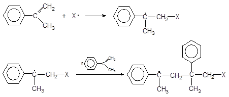 a-Метилстирол самопроизвольно не полимеризуется; с кислородом образует перекиси; гидрохинон, сера и др. ингибируют его окисление. При радикальной полимеризации образует димеры или низкомолекулярные олигомеры, но сополимеризуестя со стиролом и др. ненасыщенными мономерами; А=0,98, П=-1 ,27(константы Алфея и Прайса).