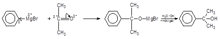 В различной литературе можно встретить несколько методик лабораторного получения a-метилстирола, которые не принципиально не различаются между собой. Основаны они на реакции реактивов Гриньяра с ацетоном. При этом карбонильный атом углерода образует новую связь С-С с бензольным кольцом, в то время как элеткроположительная группа –MgBr, образует связь с более электоотрицательным (по сравнению с углеродом бензольного кольца) атомом кислорода. Соответственно разрывается p-связь СО. Образуется фенил-изо-пропилат магний бромид. Последний гидролизуется в кислой или щелочной средах до диметилфенилкарбинола, который в свою очередь дегидратируется до конечного продукта.