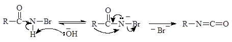 На второй стадии щелочь отщепляет протон и образуется анион N-бромамида изомеризующийся в изоцианат: