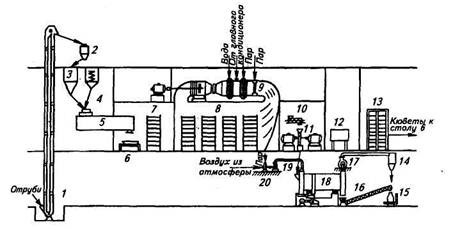 При необходимости транспортировки на дальние расстояния культуру гриба дробят на шнеке-дробилке 10 и дезинтеграторе 11 до получения частиц размером не более 10 мм и высушивают в сушилке 18 теплым воздухом до содержания влаги не более 10 . 12 %. Воздух нагревают в калорифере 20 и подают в сушилку вентилятором 19. Отработавший воздух удаляют вентилятором 17 и выбрасывают в атмосферу через циклон 14. Высушенную культуру шнеком 16 подают на весы 75 для фасования. Сюда же подаются уловленные в циклоне частички культуры, унесенные воздухом. Освободившиеся кюветы проходят через мойку 12, обеспложиваются в стерилизаторе 13 и возвращаются под загрузку.
