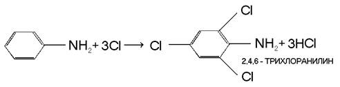 Некоторые особые свойства анилина обусловлены наличием в его молекуле ароматического ядра. Так, анилин легко взаимодействует в растворах с хлором и бромом, при этом происходит замещение атомов водорода в бензольном ядре, находящихся в орто- и пара-положенияхк аминогруппе: