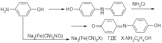 Предполагалось, что добавляемый в раствор нитропруссид натрия служит в этих процессах катализатором, однако наши исследования показали, что он вступает в реакцию с парааминофенолом с образованием продукта, имеющего также синюю окраску. Реакция идет в обоих направлениях, и в результате интенсивность получаемой окраски возрастает и повышается чувствительность метода: