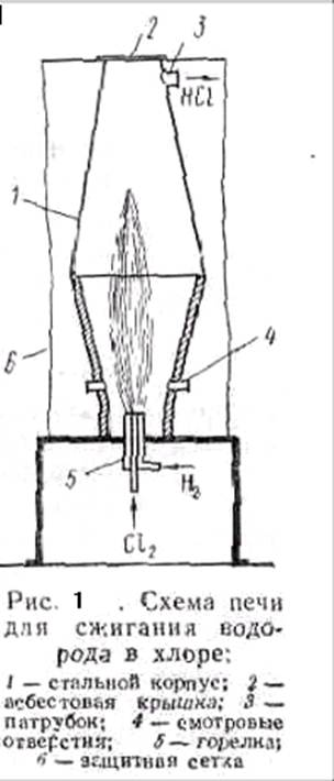 Синтез проводят при избытке 5—10% водорода и высокой температуре в печи, корпус которой изготовляют из углеродистой или легированной стали, а крышку из асбеста. Нижняя часть печи (рис.1) выложена огнеупорным материалом. В ней помещена горелка, состоящая из двух концентрически расположенных стальных трубок. По наружной трубке в печь подается водород, а по внутренней — хлор. Которые на выходе из горелки смешиваются и спокойно реагируют; образуя факел горения с температурой 2000—2400° С.
