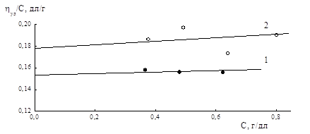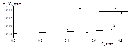 Рисунок 5.7 – Зависимость ηприв – С, растворов в ацетоне (1) и тетрагидрофуране (2) (СПЛ 2)