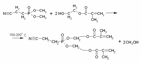 В колбу Кляйзена, снабженную водяным холодильником, помещают диметилового эфира β-цианоэтилфосфоновой кислоты. Добавляют моноэтиленгликольметакрилат (МЭГ), а также около 1 % гидрохинона для ингибирования реакции полимеризации МЭГа. Нагревают силиконовую баню до ~150°С и выдерживают эту температуру в течение 5-6 часов.