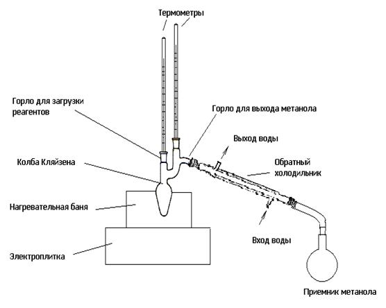 По мере протекания реакции переэтерификации, проходя через водяной холодильник, конденсируются пары метанола, который собирается в приемник.