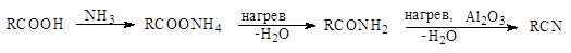 Дегидратация амидов, о которой мы говорили в предыдущем разделе может служить последней стадией в цепи превращений карбоновой кислоты в нитрил этой кислоты: