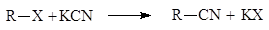При взаимодействии галогенуглеводородов с цианидом калия в водном этаноле по механизму SN2 образуются нитрилы:
