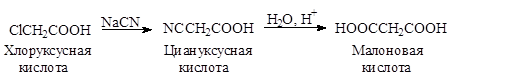 Малоновую кислоту главным образом получают из хлоруксусной кислоты по схеме: