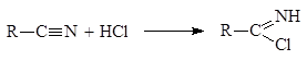 Нитрилы взаимодействуя с хлороводородом превращаются в иминохлориды: