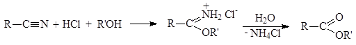 Действие на нитрилы хлороводорода в спирте приводит к образованию гидрохлоридов иминоэфиров, дальнейший гидролиз которых дает эфиры: