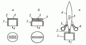 а) и б) обычная горелка Меккера и усовершенствованная горелка: 1 — корпус горелки; 2 — поверхность, на которой формируется пламя; 3 — отверстия для выхода горючих газов; 4 — подача смеси горючих газов и аэрозоля; 5 — выступ на корпусе горелки с отверстиями; в) комбинированная горелка с разделением зон испарения — атомизации и возбуждения спектров: 1 — основная горелка с выступом и отверстиями в нем; 3 — вторая дополнительная горелка с однотипным или более высокотемпературным пламенем; 4 — пламя; 5 — зона регистрации излучения; 6 — подача смеси горючих газов в дополнительную горелку; 7 — подача смеси горючих газов и аэрозоля в основную горелку.