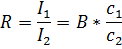 Относительная интенсивность (R) двух гомологических линий различных элементов не зависит от температуры, а определяется только их концентрацией c1 и с2.