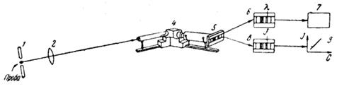 1 — источник света; 2 — осветительный конденсор; 3 — кювета для анализируемой пробы; 4 — спектральный аппарат; 5 — регистрация спектра; 6 — определение длины волны спектральных линий или полос; 7 — качественный анализ пробы с помощью таблиц и атласов; 8 — определение интенсивности линий или полос;