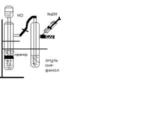 Ход работы: В одно колено сосуда Ландольта поместить кристаллы фенола и прилить дистиллированной воды. Встряхнуть, добиться получения эмульсии фенола. В другое колено прилить раствор едкого натра. Закрыть сосуд пробкой с трубкой и активированным углем. Раствор щелочи перелить в другое колено сосуда Ландольта. Наблюдать образование прозрачного раствора фенолята натрия.
