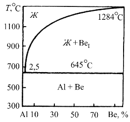 Серьезный недостаток Ве, заключающийся в низкой ударной вязкости и хладноломкости, может быть преодолен использованием сплавов с Al. Из диаграммы состояния Al–Be видно, что эти элементы практически взаимно нерастворимы.