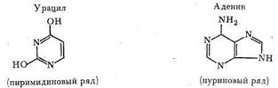 Примером гетероциклических оснований могут служить аденин и урацил: