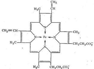 Транспорт О2 в организме животных и человека осуществляется железосодержащими комплексами - гемоглобином и миоглобином. Оба этих белка содержат «гем-группы», представляющие собой порфириновый комплекс железа:
