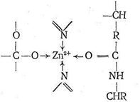 Предполагают, что одной из важных стадий каталитического процесса, протекающего с участием карбоксипептидазы, является координация ионом Zn2+ атома кислорода карбонила пептидной цепи с вытеснением Н2О, занимающей одно место в координационной сфере. Координация цинком карбонильного кислорода ослабляет связь С-N в пептидной цепи, что облегчает ее разрыв, сопровождающийся гидролизом. Гидролиз разорванной цепи приводит к ослаблению координации карбонильного кислорода пептидной цепи ионом Zn2+. Происходит вытеснение молекулой Н2О, затем вновь следует координация ионом Zn2+ карбонильного кислорода неразорванной цепи и т, д, Ферментативная активность карбоксипептидазы сохраняется, если Zn2+ заменить на ион Со2+, так же как в случае карбоангидразы. По-видимому, это связано с очень близкими величинами констант устойчивости (т. е. сходными термодинамическими, характеристиками) аналогичных комплексов Zn2+ и Со2+, а также одинаковыми размерами этих ионов. Замена Zn2+ в карбоксипептидазе на Gd2+, Hg2+, Cu2+, Pb2+ приводит к исчезновению каталитической активности фермента.
