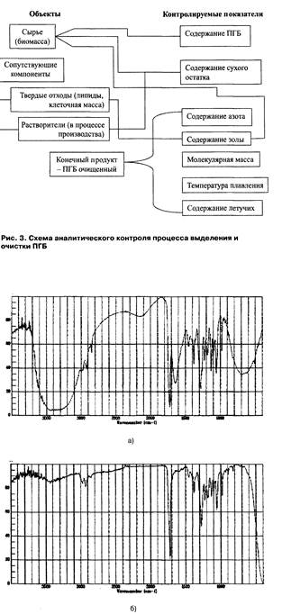 Состав исходной сырой биомассы, а также продуктов, образующихся в процессе её очистки, исследовали методом ИК-спектроскопии. ИК-спектры снимали на Фурье-спектрофотометре фирмы PerkinElmer(США) 1710 области 4000 -400 см-1 в виде таблеток, запрессованных с КВт для твердых образцов, и в виде пленок, нанесенных на окошки KRS-5 или КВт для жидких (рис. 4). Содержание азота определяли по методу Кьельдаля, температуру и теплоту плавления образцов ПГБ — методом дифференциальной сканирующей калориметрии на приборе PerkinElmerDiamondDSC. Зольность оценивалась по ГОСТ 15973-82. Сухой остаток определяли сушкой при температуре 105 °С до постоянной массы, содержание воды в растворителях — методом кулонометрического титрования с реактивом Фишера на влагомере мод. СА-02 фирмы Mitcubsi(Япония).