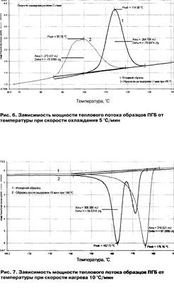 Температуру и теплоту плавления образцов ПГБ определяли методом дифференциальной сканирующей калориметрии на приборе Perkin Elmer Diamond DSC на образце массой 3 — 6 мг, который помещали в алюминиевую чашку массой 18 — 19 мг, нагревали со скоростью 10 °С/мин и регистрировали изменение теплового потока между образом и эталоном сравнения.