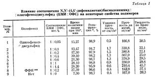 Взаимодействие ОФС и БМИ осуществляли смешением компонентов в различных соотношениях при 180° в течение 40 мин с последующим отверждением при этой же температуре в пресс-форме при давлении 50 Мн/м2 [9]. Условия получения и некоторые свойства полученных образцов приведены в табл. 1.