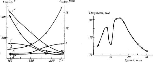 Известно, что подготовка пресс-материала вальцеванием оказывает значительное влияние на качество пресс-изделий [12, 13], поэтому было предпринято исследование по определению оптимального режима вальцевания КМ. Оценку проводили определением текучести КМ по Ратлигу [13] при 230° и времени выдержки 3 мин (рис. 3) и определением прочности образцов, отпрессованных на основе пресс-масс с различным временем вальцевания (табл. 3).