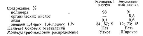Сравнительные свойства растворных бутадиен-стирольных каучуков и каучуков, получаемых эмульсионной полимеризацией (типа СКС-30 АРК), приводятся ниже [4]: