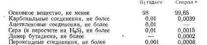 Сополимеризацию бутадиена со стиролом проводят в водных эмульсиях, образование полимера протекает по механизму радикальной полимеризации. Основное количество бутадиен-стирольных каучуков производят при 5 °С (низкотемпературные каучуки), некоторые марки получают при 50 °С (высокотемпературные каучуки). Требования к чистоте мономеров приведены ниже, % (масс) [4]: