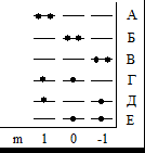 Возможно всего шесть размещений внутри p-АО без учёта спина Орбитальные распре-деления можно охарак-теризовать комбинаци-ями квантовых чисел частиц (m1, m2): (+1,+1) А (0, 0) Б (- 1, - 1) В (+1, 0) Г (+1, - 1) Д (0, - 1) Е |