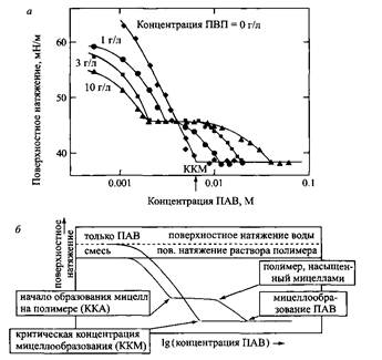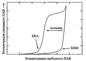 Такой вид концентрационной зависимости поверхностного натяжения растворов ПАВ в присутствии полимера можно объяснить следующим образом. При некоторой концентрации, которую принято называть критической концентрацией ассоциации (ККА), начинается ассоциация молекул ПАВ и полимера. По этой причине при дальнейшем увеличении концентрации ПАВ его активность не увеличивается, и поверхностное натяжение остается постоянным. При насыщении полимера молекулами ПАВ концентрация последнего и активность снова начинают расти, а поверхностное натяжение уменьшается вплоть до достижения KKM поверхностно-активного вещества, после чего в растворе начинают формироваться обычные мицеллы ПАВ.