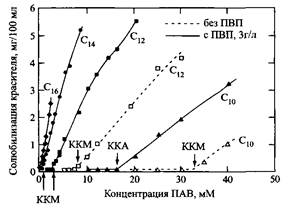 Приведенное объяснение подтверждается исследованиями солюбилизации (рис. 3). Кривые солюбилизации в присутствии полимера сдвинуты в сторону более низких концентраций ПАВ, а по виду они аналогичны зависимостям, полученным в отсутствие полимера. По точкам излома можно оценить значения KKM или ККА, которые уменьшаются так же, как при увеличении длины алкильной цепи молекул ПАВ в отсутствие полимера.