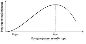 Рисунок 1. Зависимость величины индукционного периода окисления полимеров от концентрации ингибитора окисления (указаны критическая и оптимальная концентрации ингибитора)