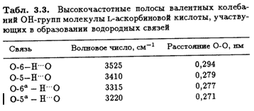 Так как длины водородных связей (и соответственно прочность) в кристалле известны, можно провести корреляцию этих максимумов поглощения и характеристических валентных колебаний ОН-групп, участвующих в образовании водородных связей. Очевидно, что четыре отчетливых пика в высокочастотном крыле спектра соответствуют спиртовым ОН-группам при С-5 и С-6 боковой цепи (табл. 3.3).