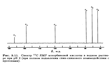 В спектре 13С ЯМР L-аскорбиновой кислоты при полном подавлении спин-спинового взаимодействия с протонами, как и ожидалось, появились сигналов, которые были соотнесены с конкретными атомами молекулы (рис. 3.11).
