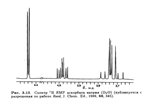 Тонкая структура этих сигналов не проявляется в низких магмагнитных полях (60 или 100 МГц), но выше 300 МГц обнаруживается спин-спиновое взаимодействие, не являющееся взаимодействием первого порядка. Это расщепление особенно заметно в спектре 1Н ЯМР аскорбата натрия (рис. 3.12).