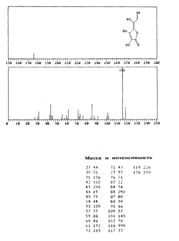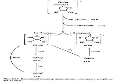 В масс-спектре L-аскорбиновой кислоты, зафиксированном при ионизации молекулы под действием электронного удара, имеется интенсивный пик с m/е 116 наряду с пиком молекулярного иона (m/е 176) (рис. 3.15). Было высказано предположение, что фрагментация происходит за счет отщепления боковой цепи с последующим разрушением кольца, что соответствует наличию наиболее интенсивных сигналов (рис. 3.16).