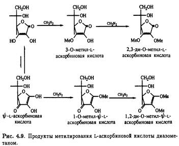 3-О-метиласкорбиновая кислота. Реакция сопровождается образованием небольших количеств 1-метил-ψ-L-аскорбиновой кислоты вследствие присутствия минорных количеств таутомера. Оба соединения подвергаются дальнейшему етилированию диазометаном,давая 2,3-ди-О-метил-L-аскорбиновую и 1,2-ди-O-метил- ψ-L-аскорбиновую кислоту соответственно (рис. 4.9)