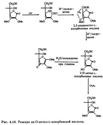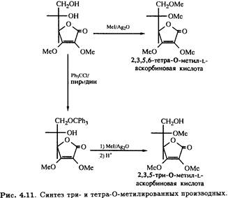 2,3-Ди-О-метил-L-аскорбиновая кислота может быть подвергнута дальнейшему метилированию иодметаном в присутствии оксида серебра с образованием 2,3,5,6-тетра-О-метилированного продукта, а также тритилированию первичной спиртовой группы при С-6. Метилирование с последующим снятием тритильной защитной группировки в кислой среде приводит к 2,3,5-три-О-метильному производному (рис. 4.11), которое, как было показано, участвует в цепи превращений, идентичных приведенным на рис. 4.10, и превращается в бициклическое 2,3,5-изотриметильное производное.