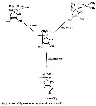 Катализируемое кислотами образование ацеталей и кеталей аскорбиновой кислоты применяется для специфической защиты одновременно двух гидроксильных групп в процессе структурной модификации. Такие 5,6-О-производные, как изопропилиденкеталь и бензилиденацеталь, хорошо известны, а недавно появилась возможность селективно защищать гидроксильные группы при
