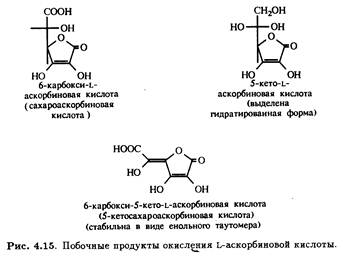 Окисление первичной и вторичной спиртовых групп аскорбиновой кислоты при С-5 и С-6 может теоретически приводить к образованию ряда побочных продуктов. Получение таких производных непосредственно из L-аскорбиновой кислоты требует селективной защиты гидроксилов при С-2 и С-3. На рис. 4.15 приведены примеры соединений такого типа, которые удалось выделить.