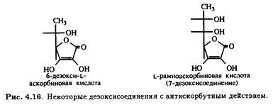 Известно, что 6-дезокси-L-аскорбиновая и L-рамноаскорбиновая кислоты (рис. 4.16) сохраняют соответственно 30 и 20% антискорбутной активности витамина С. В последние годы были синтезированы еще некоторые соединения такого типа (рис. 4.17). Обнадеживает, что 6-хлор-6-дезоксипроизводное обладает повышенной термической стабильностью по сравнению с витамином С и в то же время обладает заметной антицинготной активностью.