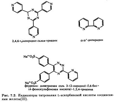 Эта реакция лежит в основе наиболее популярного титриметрического метода анализа витамина С. Она проста в исполнении благодаря легкости определения конечной точки титрования и без труда может быть использована для анализа растворов, содержащих довольно высокие концентрации витамина С. К сожалению, данный метод очень чувствителен к присутствию других восстановителей, с которыми витамин С часто соседствует в растворах (диоксид серы, таннины, ионы металлов, восстанавливающие сахара и т. п.). В каждом конкретном случае есть способы уменьшить влияние примеси, но устранить эффект всех примесных восстановителей в анализируемом растворе одновременно невозможно. И если раствор первоначально окрашен, это маскирует изменение цвета вследствие реакции; в таких случаях для определения конечной точки использовали разнообразные инструментальные методы, например, полярографию. Было предложено много других титрующих реагентов, например, соединения железа(Ш). В этом случае конечную точку определяют при добавлении в качестве индикаторов феррозина, а, а'- дипиридина или 2,4,6-трипиридил-симм-триазина (рис. 7.2).